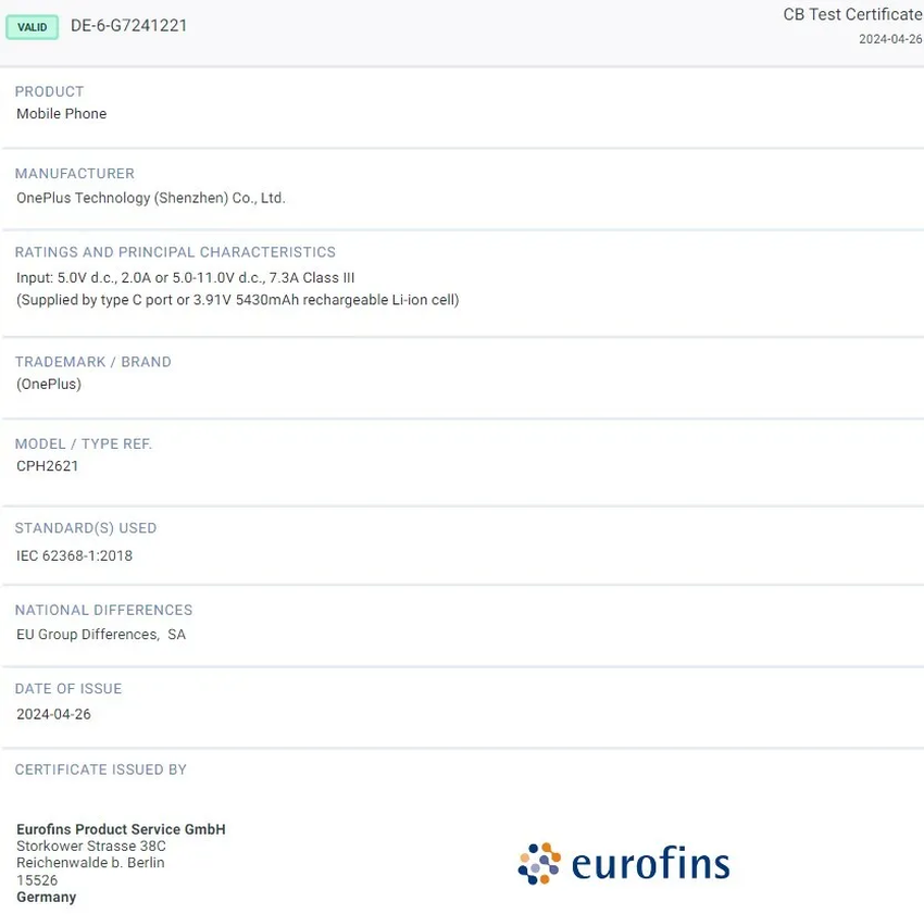 Tijdens het Eurofins certificeringsproces werd bevestigd dat het toestel een grote 5430 mAh batterij heeft. Vermoedelijk zal de typische capaciteit 5500 mAh zijn, wat hetzelfde is als de OnePlus Ace 3V. Het enige opmerkelijke verschil is de bevestiging van 80W oplaadondersteuning in deze certificering, wat iets anders is dan de 100W die de OnePlus Ace 3V biedt.