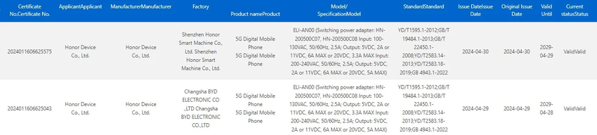 Onlangs zijn twee Honor-telefoons met modelnummers ELP-AN00 en ELI-AN00 goedgekeurd door de Chinese certificeringsinstantie 3C. De 3C certificering van de vermeende Honor 200 en 200 Pro modellen geeft aan dat beide modellen 100W snelladen kunnen ondersteunen. Op dit moment zijn er twee modelnummers aangegeven: de ELP-AN00 en ELI-AN00. Het is onduidelijk welke van deze modellen de standaardversie vertegenwoordigt en welke overeenkomt met de Pro-variant.