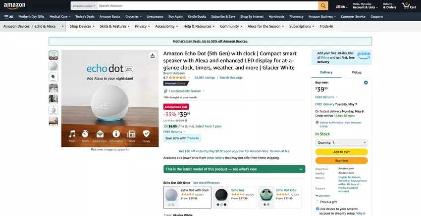 Amazon verlaagt de prijs van Echo Dot 5 Gen: een slimme speaker met ingebouwde klok en Alexa voor $39