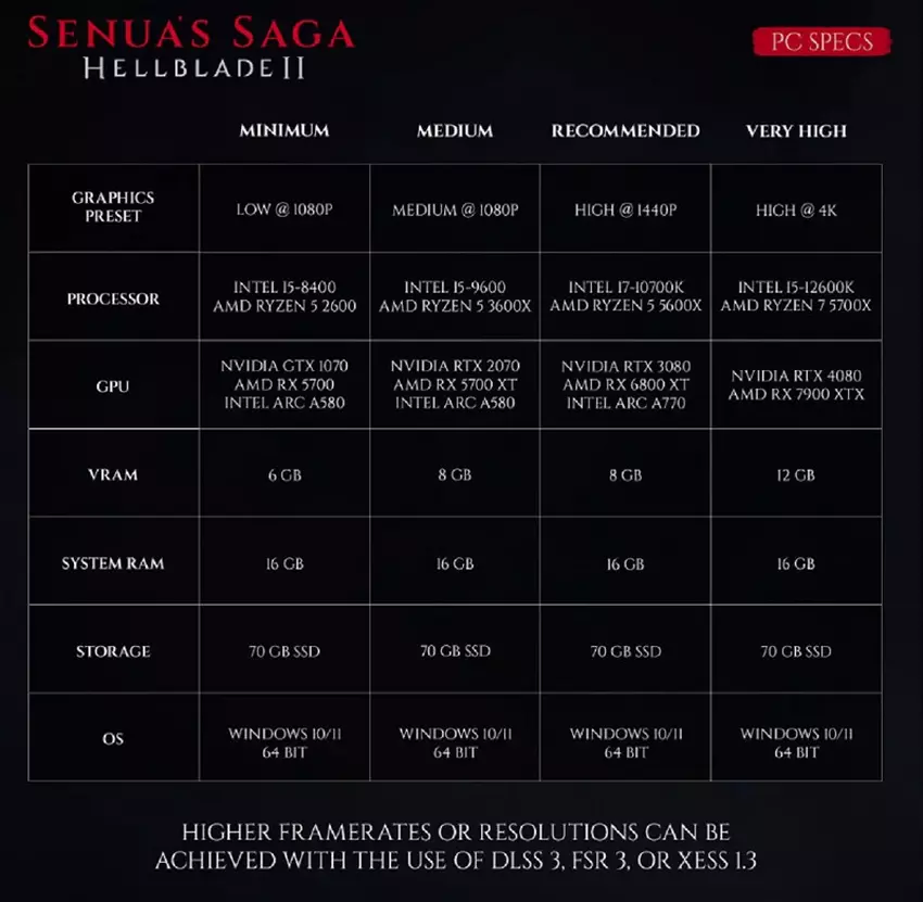 Zoals verwacht zal Hellblade II een behoorlijk veeleisende game zijn, die op minimale instellingen zelfs de bezitters van een pc met weinig vermogen zal kunnen draaien, maar om optimaal te kunnen genieten van al het moois dat het oude IJsland te bieden heeft, heb je de modernste computer nodig.