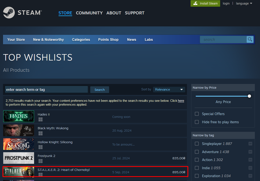 Vanaf nu behoort S.T.A.L.K.E.R. 2: Heart of Chornobyl tot de vijf meest begeerde games op Steam. Op dit moment moet ik meteen denken aan het commentaar van Russische spelers: "Nou, wie heeft het spel nodig buiten ons land?". Zoals je kunt zien, zijn er zoveel mensen dat het spel de top vijf heeft gehaald.
