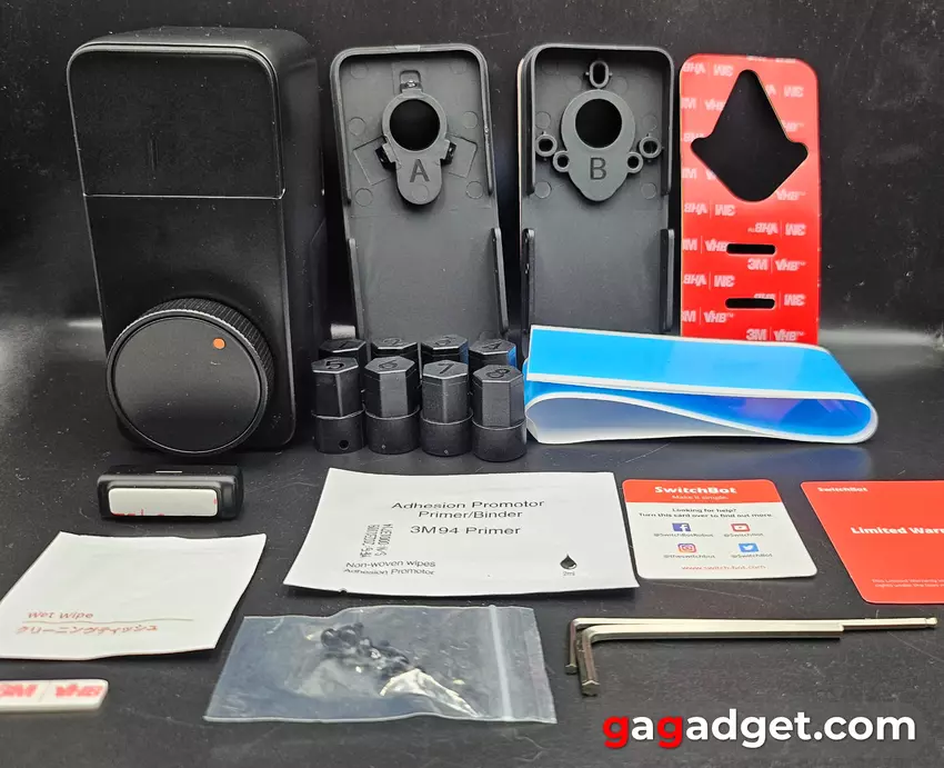 De binnenkant van de doos kan een beetje intimiderend en verwarrend zijn voor de onervaren gebruiker. Maar de kit voorziet gewoon in alle eventualiteiten en de helft van de inhoud zul je gewoon niet nodig hebben. Het pakket bevat twee pads (voor sloten met eurocilinder en spiegel), een set van 8 (!) adapters voor installatie op de spiegel, een magneet op dubbel plakband (hierdoor "begrijpt" het slimme slot dat de deuren open zijn). En ook natte en droge doekjes (ik had ze niet nodig, evenals blauwe tape, die je nodig hebt om het slot na installatie in een van de opties vast te zetten). Ook een gereedschap, een set schroeven en twee memokaartjes met QR-codes voor het garantiebeleid en het adres van de technische ondersteuning op de SwitchBot website.