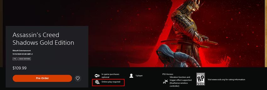 Maar dat is nog niet alles. Op de PS Store-pagina van het spel staat dat het spel een constante internetverbinding vereist. Ja, je leest het goed, de singleplayer game vereist een verbinding om te spelen.