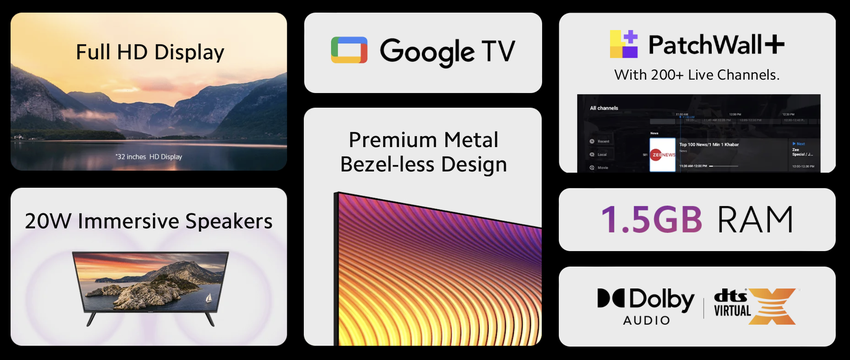 De tv's worden geleverd met Google TV aan boord en Patchwall+ interface. De nieuwigheden hebben een 20W audiosysteem met Dolby Audio en DTS:X ondersteuning. De poorten zijn HDMI, USB 2.0 en Ethernet. De tv's ondersteunen Chromecast.