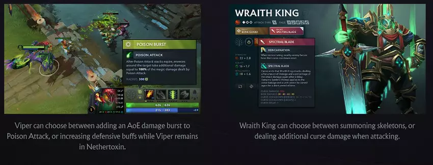 - Aspecten beïnvloeden helden op veel verschillende manieren. Viper kan bijvoorbeeld onmiddellijke schade toevoegen rond een slachtoffer van Poison Attack of meer overlevingskansen krijgen in het Nethertoxin-effectgebied, terwijl Wraith King skeletten kan oproepen of extra Jinx-schade kan toebrengen met zijn aanvallen.