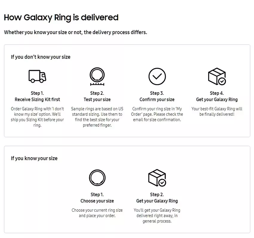 In tegenstelling tot de Galaxy Watch kan de grootte van de Galaxy Ring niet worden aangepast. Samsung is van plan om verschillende maten te verkopen en voor degenen die hun maat niet weten, zal het bedrijf een uniek leveringsproces aanbieden. Na het plaatsen van een bestelling en het selecteren van de optie "Ik weet mijn maat niet", krijgen klanten een set voorbeeldringen toegestuurd om hen te helpen de beste maat te vinden.