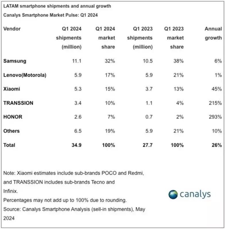 High-end apparaten blijven minder populair onder Latijns-Amerikaanse gebruikers, wat wordt weerspiegeld in de verkoop van Samsung en andere fabrikanten. Tegelijkertijd laten andere merken zoals Xiaomi, Transsion en Honor een aanzienlijke jaar-op-jaar groei zien in de verkoop, variërend van 45% tot 293%.