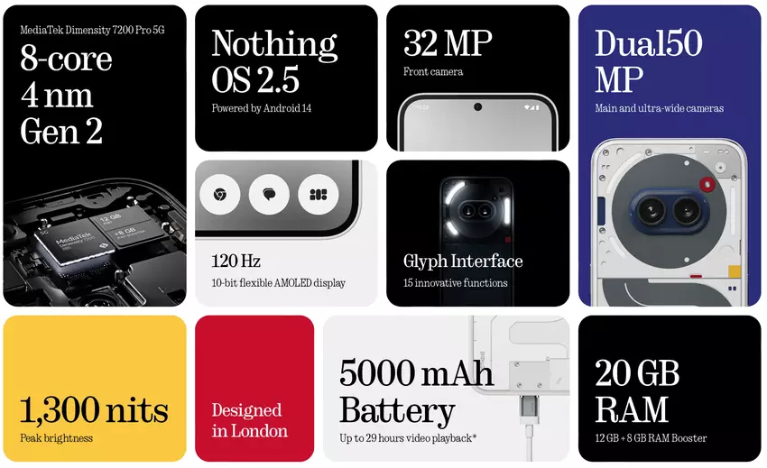 Als we het hebben over de specificaties van de Phone (2a) Special Edition, dan zijn die niet veranderd. De gadget heeft nog steeds een 120Hz AMOLED display, IP54 waterbescherming, sub-screen vingerafdrukscanner, MediaTek Dimensity 7200 Pro processor, 50 MP + 50 MP hoofdcamera, 5000 mAh batterij met 45W opladen en Glyph achtergrondverlichting.