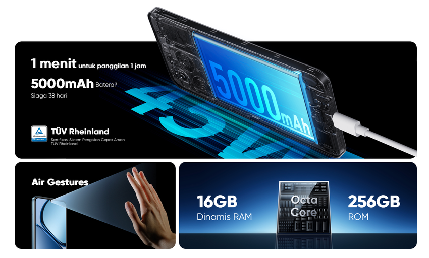 De realme C63 wordt aangedreven door een Unisoc T612 SoC-processor in combinatie met 8GB RAM en 256GB opslagruimte. De gadget wordt aangedreven door een 5.000mAh batterij. Het ondersteunt 45W opladen. Uit de doos draait het toestel het Android 14 besturingssysteem. De smartphone wordt geleverd met IP54-bescherming, NFC, 3,5 mm aansluiting, zijscanner en microSD-slot.