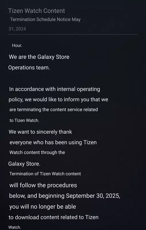 Volgens het schema dat is gepubliceerd door Reddit-gebruiker Seaweed_Maximum, wordt de verkoop van betaalde content voor Tizen-horloges gestopt op 30 september 2024. Op 31 mei 2025 zal de mogelijkheid om gratis applicaties te downloaden helemaal stoppen.