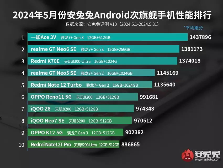 De Redmi K70E met MediaTek Dimensity 8300-Ultra aan boord sloot de top drie. Het wordt ondersteund door de realme GT Neo 5 SE en Redmi Note 12 Turbo. Beide worden aangedreven door de Qualcomm Snapdragon 7+ Gen 2-processor.