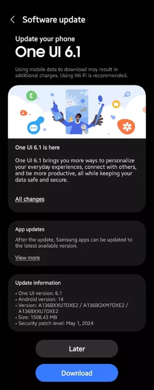De nieuwe softwareversie bevat Google's beveiligingspatch van mei en verschillende One UI 6.1 vernieuwingen. Bijvoorbeeld een licht bijgewerkte UI, verbeterde branded apps, verschillende nieuwe functies, etc. In tegenstelling tot de vlaggenschip toestellen, krijgt de Galaxy A13 5G geen Galaxy AI.