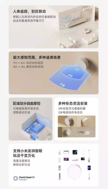 De sensor ondersteunt de afbakening van maximaal 12 zones zonder overspraak. De sensor heeft een detectiehoek van 110 graden en kan menselijke bewegingen tot op een afstand van 7 meter volgen. Het nieuwe product kan ook statische menselijke lichamen detecteren tot op een afstand van 4 meter.