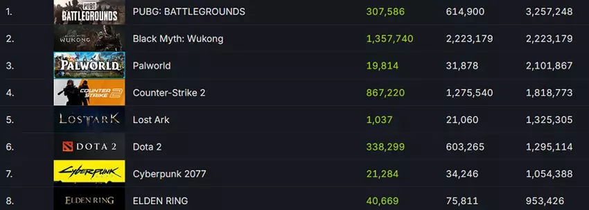 Op de dag van de release bereikte Black Myth: WuKong een online piek van meer dan 2,2 miljoen mensen - en dat is alleen nog maar op Steam! Het spel heeft superpopulaire games als Counter-Strike 2, Cyberpunk 2077, Elden Ring, Hogwarts Legacy, Baldur's Gate 3 en Palworld voorbijgestreefd en is met 3,2 miljoen spelers alleen tweede na PUBG. Maar dit aantal lijkt niet onbereikbaar en waarschijnlijk wordt Monkey King in de komende dagen ook de koning van Steam.