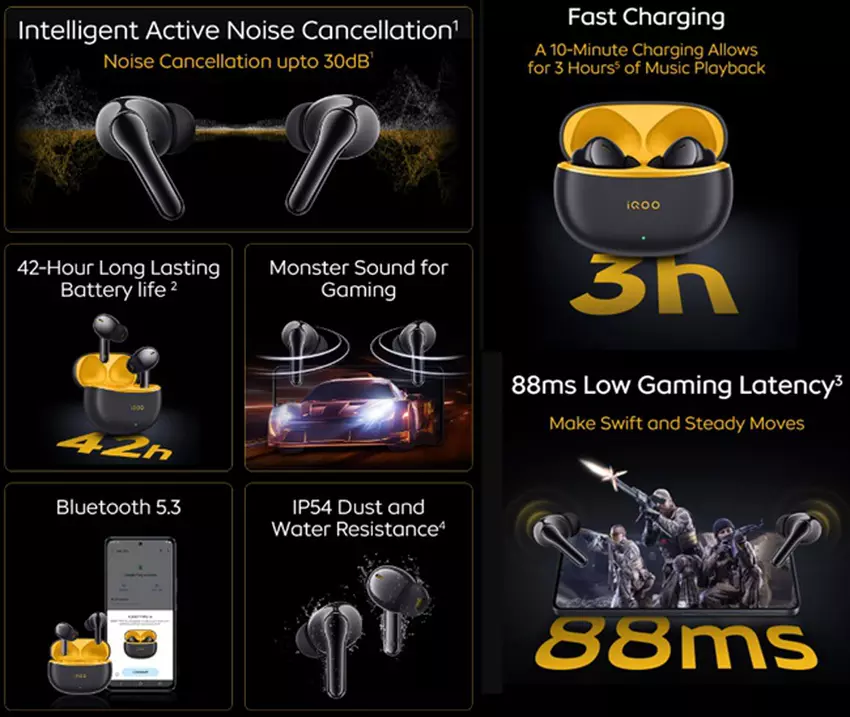 De hoofdtelefoon heeft een in-canal design en een zwart met gele behuizing. Het apparaat is uitgerust met Bluetooth 5.3, DeepX 3.0 Stereo en 3D Panoramic Audio technologieën. De nieuwigheid ondersteunt Active Noise Cancellation (tot 30 dB), evenals een gaming-modus met een vertraging van maximaal 88 ms. Met één keer opladen gaat de iQOO TWS 1e tot 42 uur mee in een hoesje. Het apparaat wordt opgeladen via de USB-C poort.