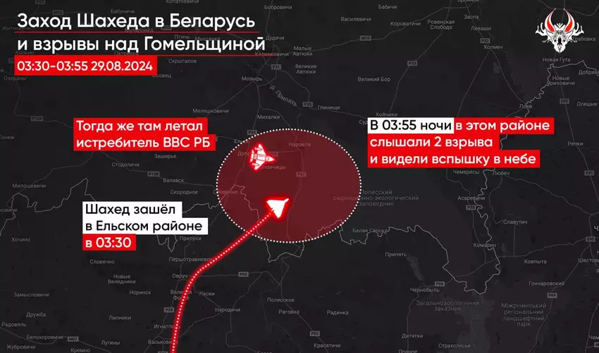 Het TelegramkanaalBelaruski Gayun bericht over het neerhalen van een Russische Shahed UAV boven het grondgebied van Wit-Rusland. In de nacht van 29 augustus 2024, tijdens een nieuwe Russische aanval op Oekraïne, vloog een van de Shahed drones opnieuw het grondgebied van Wit-Rusland binnen in het Jel district van de Gomel regio. Het overschrijden van de grens met Wit-Rusland werd om 3.30 uur bevestigd door het telegramkanaal "Nikolajevski Vanyok".