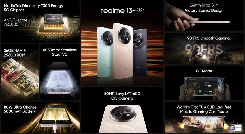 realme 13+ 5G: 120Hz AMOLED-scherm, IP65-bescherming, Dimensity 7300 Energy-chip en prijs vanaf 275 dollar
