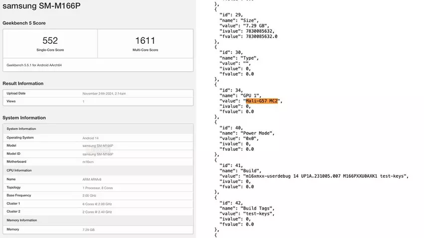 De smartphone heeft het modelnummer SM-M166P en scoorde 552 punten in de single-core test en 1.611 punten in de multi-core test. De specslijst geeft aan dat het toestel op Android 14 zal draaien en is uitgerust met 8GB RAM.