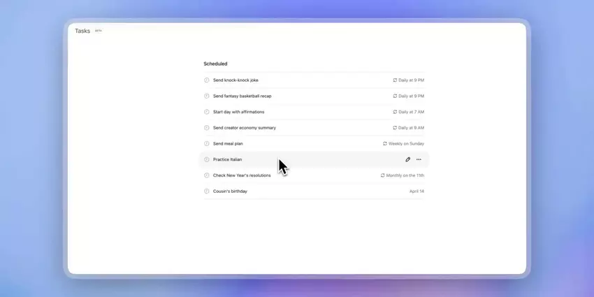 "Als onderdeel van deze vroege bèta kun je taken aanmaken waarmee ChatGPT automatisch verzoeken kan vervullen en volgens een schema bij je terug kan komen. Je kunt ChatGPT bijvoorbeeld vragen om de volgende taken uit te voeren.