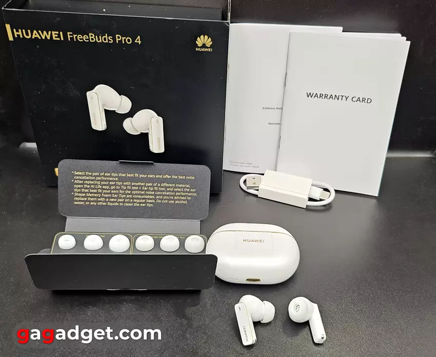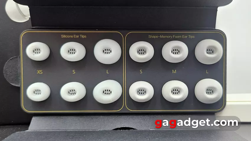 Hier is de eerste verrassing - het pakket bevat 6 (!) extra paar oorkussentjes in 3 maten. Dit zijn twee sets - een met siliconen oorkussens en de andere met schuimrubberen oorkussens die het zogenaamde geheugeneffect hebben, dat wil zeggen dat ze hun vorm een beetje veranderen en het onthouden. Dit is een belangrijk voordeel omdat mensen verschillende oren hebben. En de nauwsluitende pasvorm (en de schuimrubberen oorkussens dragen hieraan bij) zorgt voor een betere geluidsbescherming. De rest van het pakket is standaard - een USB-C kabel (tegenwoordig hadden ze die er misschien niet bij gedaan, de oplader is weg, maar dat is voor niemand een verrassing vandaag de dag) en twee brochures - een garantiekaart en een gebruikershandleiding.