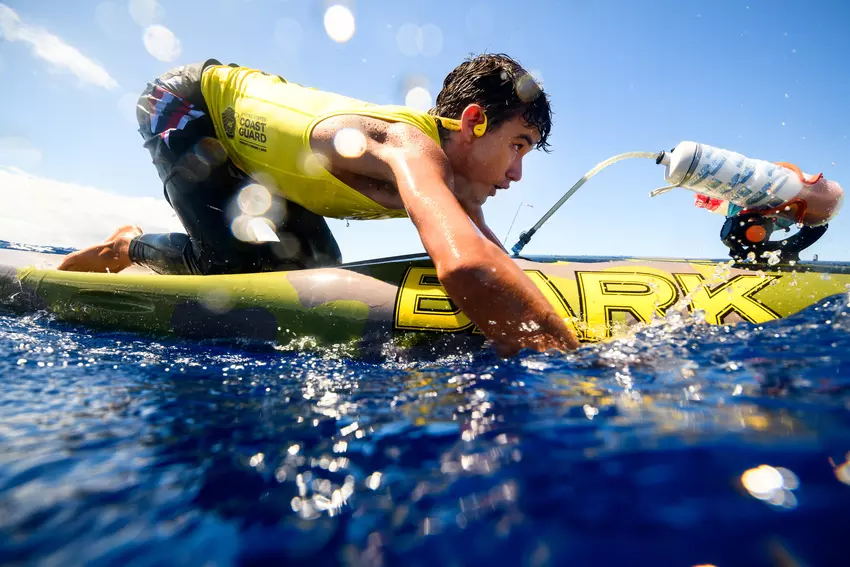 Toa Pere steekt de Kaiwi Strait over tijdens de Wereld Sapboard Kampioenschappen. Bron: Shane Grace