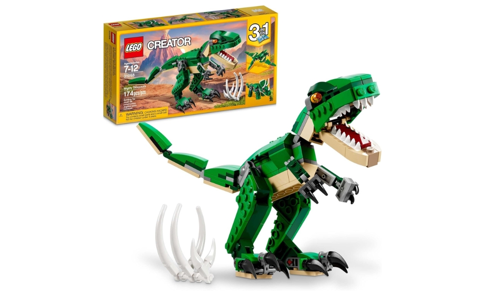 LEGO's Creator Mighty Dinosaur transformeert 174 stukjes in drie verschillende prehistorische wezens. De primaire bouw creëert T-Rex speelgoed met donkergroene en beige kleuren, oranje ogen, beweegbare gewrichten en het openen van de mond met puntige tanden. Het bijgeleverde ribbenkaststuk stelt een prooi van de dinosaurus voor. Het model kan worden omgebouwd tot Triceratops of Pterodactyl met dezelfde stenen. Doelleeftijd 7-12 jaar stimuleert fantasierijk spel en de ontwikkeling van bouwvaardigheden.