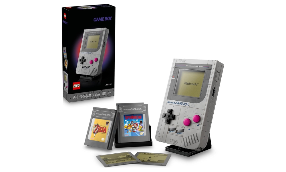 LEGO heeft Nintendo's Game Boy uit 1989 op bijna 1:1 schaal nagebouwd met 421 stukjes voor een authentieke replica van 8,5 x 14,2 x 3,4 cm. Het model heeft werkende knoppen met tactiele feedback die de originele console nabootsen. De bouwers maken verwisselbare cartridges voor Super Mario Land en The Legend of Zelda Link's Awakening, compleet met PCB-interieur. Drie lenticulaire schermen wisselen achter het scherm en tonen spelscènes of de opstartanimatie van Nintendo. Een bouwbare standaard toont het voltooide model.