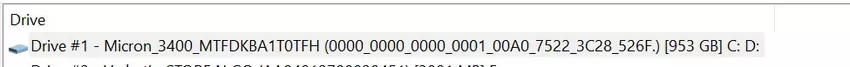 De laptop heeft twee M.2d-schijfsleuvendie elk schijven tot 1 TB ondersteunen. Er is ondersteuning voor RAID0, waardoor je aanzienlijk hogere snelheden krijgt als je twee schijven gebruikt. In de geteste configuratie hebben we een snelle NVMe SSD Micron 3400 in M.2 formaat met PCIe 4.0 x4 interface voor 1 TB.