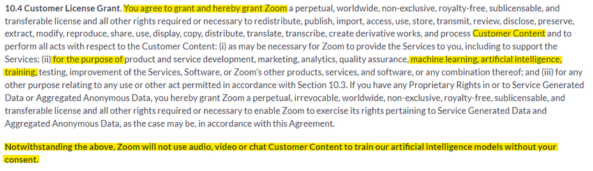 Op 11 augustus verwijderde Zoom een clausule uit zijn servicevoorwaarden die sprak over het mogelijke gebruik van klantgegevens om algoritmes voor kunstmatige intelligentie te trainen.