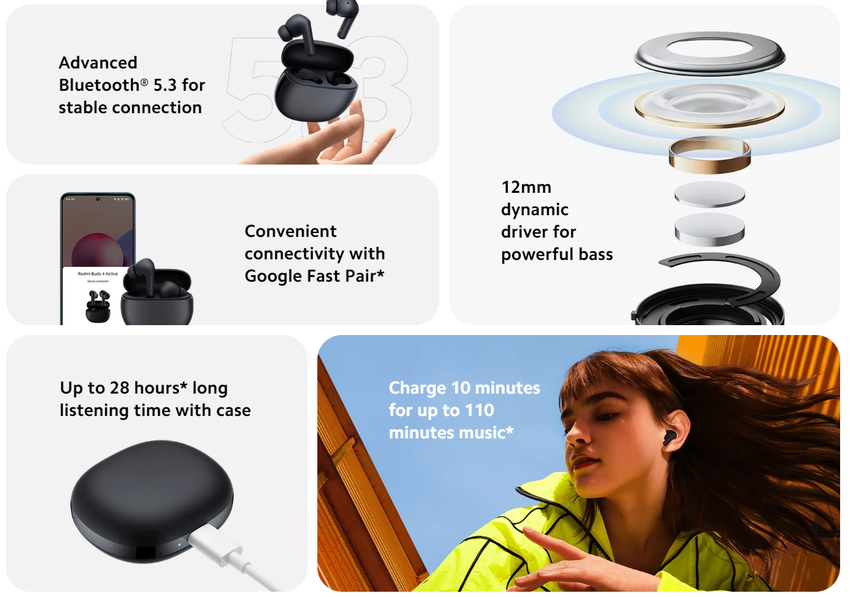 De Redmi Buds 4 Active kan tot 5 uur muziek luisteren. Een oplaadetui met een 440mAh batterij verlengt de gebruiksduur tot 28 uur. De hoofdtelefoon ondersteunt ook snel opladen - 10 minuten converteert naar 2 uur gebruik.