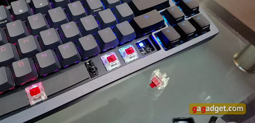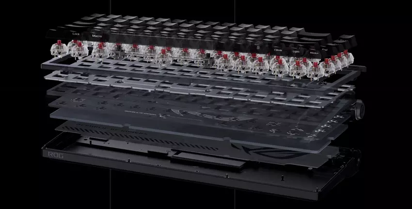 Het toetsenbord maakt gebruik van eigen ROG NX Red mechanische schakelaars met lineaire beweging en hot-swappable ondersteuning. Er zijn ook varianten met tactiele NX Blue en NX Brown, die interessanter kunnen zijn voor mensen die grote teksten typen. De ROG NX Red schakelaars hebben een activerings- en resetpunt van 1,8 mm en een volledige bewegingsvrijheid van 4 mm. De initiële drukkracht is 40 g, het activeringspunt is 45 g en de volledige drukkracht is 55 g. Er wordt beweerd dat de NX Red bestand is tegen 70 miljoen klikken. De schakelaars en lange-toetsstabilisatoren worden vanuit de fabriek gesmeerd. De ROG NX Red is zeer aangenaam en comfortabel in gebruik, zowel tijdens het gamen als bij het typen. Vooral in deze versie met extra smering en geluidsisolatie. Ze klinken en presteren perfect. De aanslag is zeer soepel, zonder zand.