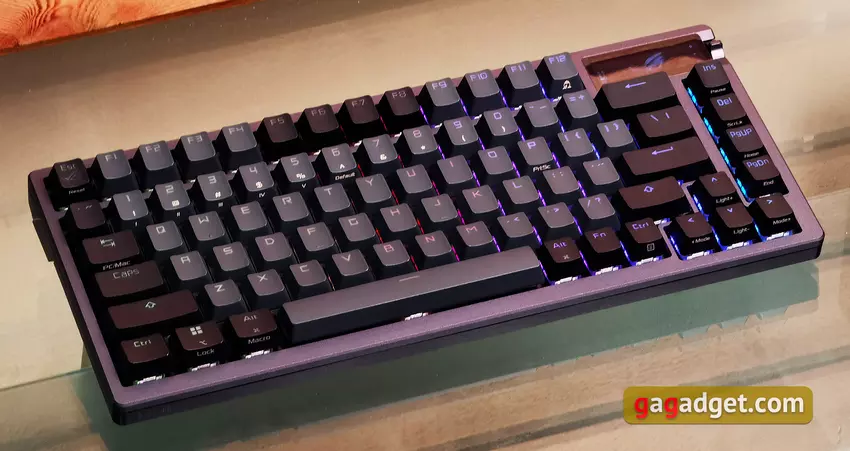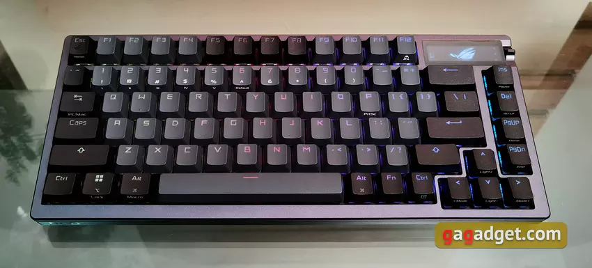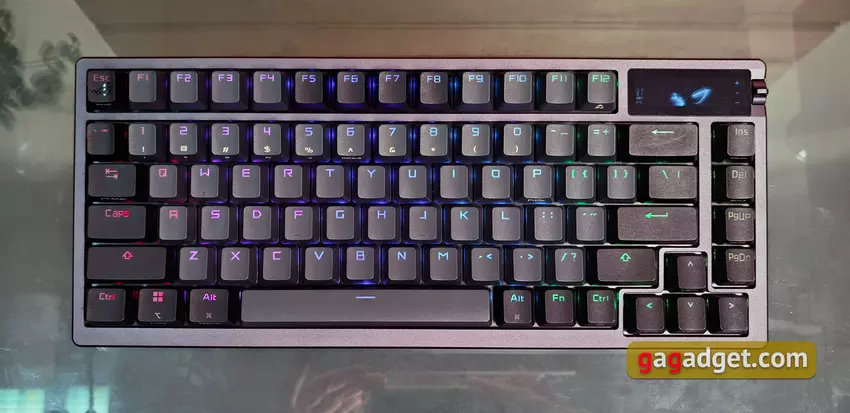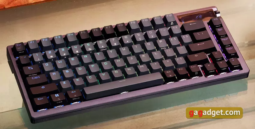 De indeling is een beetje ongebruikelijk, en dit geldt niet alleen voor de afwezigheid van een extra numeriek toetsenblok. Er zijn Ins, Del, PgUp, PgDn knoppen, ze bevinden zich verticaal aan de rechterkant en zijn lichtjes gescheiden van het hoofdtoestel. Het navigatiepijlenblok is ook apart geplaatst. Het staat iets dichter bij de gebruiker. De rechter Shift-, Alt-, Fn- en Ctrl-toetsen zijn korter en naar links verschoven. De linker Shift-, Ctrl-, Enter- en Backspace-toetsen zijn lang en hebben een standaardvorm. De F-functietoetsen hebben niet de standaardafstand en zijn duidelijk boven de corresponderende cijfers geplaatst. Het is dus even wennen als je het toetsenbord gebruikt om te typen of te werken. Alle belangrijke gamingtoetsen zitten op hun gebruikelijke plek.