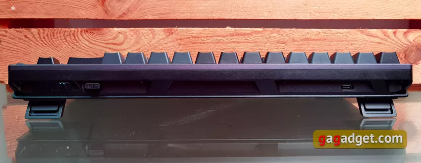 Aan de rechterkant van de achterrand zit een schakelaar voor verbindingsmodi: bedraad, 2.4 GHz en Bluetooth. Ernaast zit een vakje voor een USB-zender. Er zit een magneet in, zodat de ontvanger niet zoekraakt. Aan de rechterkant zit een Type-C connector voor opladen en bekabelde verbinding.