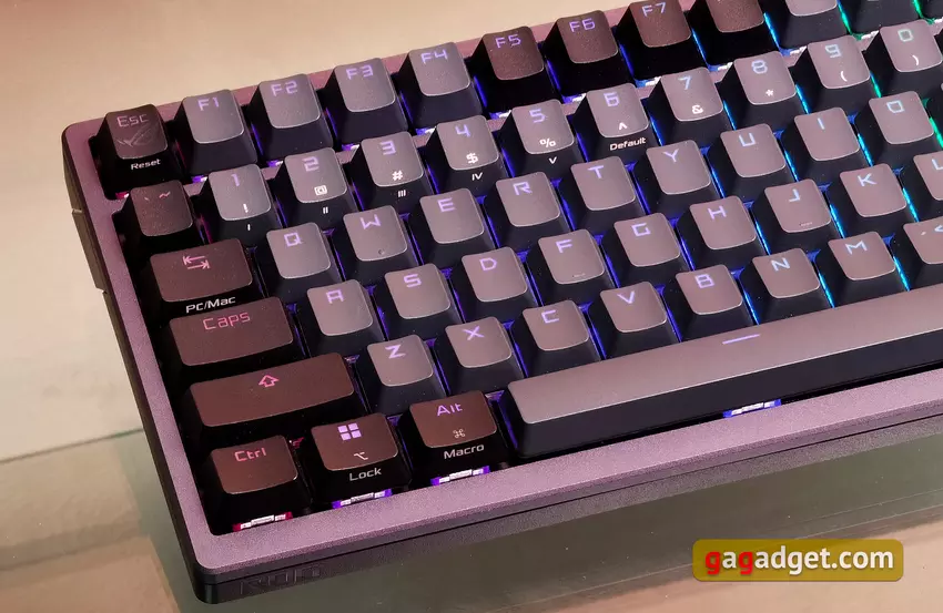 Het toetsenbord maakt gebruik van tweecomponenten ROG-kappen die zijn gemaakt door spuitgieten. Er wordt duurzaam en ruw PBT plastic gebruikt, dat niet slijt na verloop van tijd. Ondanks het gebruik van PBT zijn de toetsen verlicht. De dopjes zijn van gemiddelde hoogte en hebben een licht verkorte kern. Dit zou moeten voorkomen dat de toetsen gaan slingeren tijdens het gebruik.