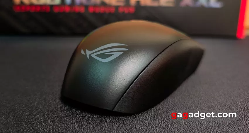 Ondanks de symmetrische vorm zitten de extra knoppen alleen aan de linkerkant van de muis, zodat je hem alleen met je rechterhand volledig kunt gebruiken. De knoppen zijn breed en hebben een duidelijke opening. Er zijn geen rubberen kussentjes; er zijn kleine diagonale inkepingen aan de voorkant van de zijkanten voor een betere grip. Aan de rechterkant staat het ROG logo.