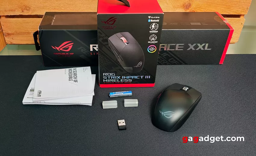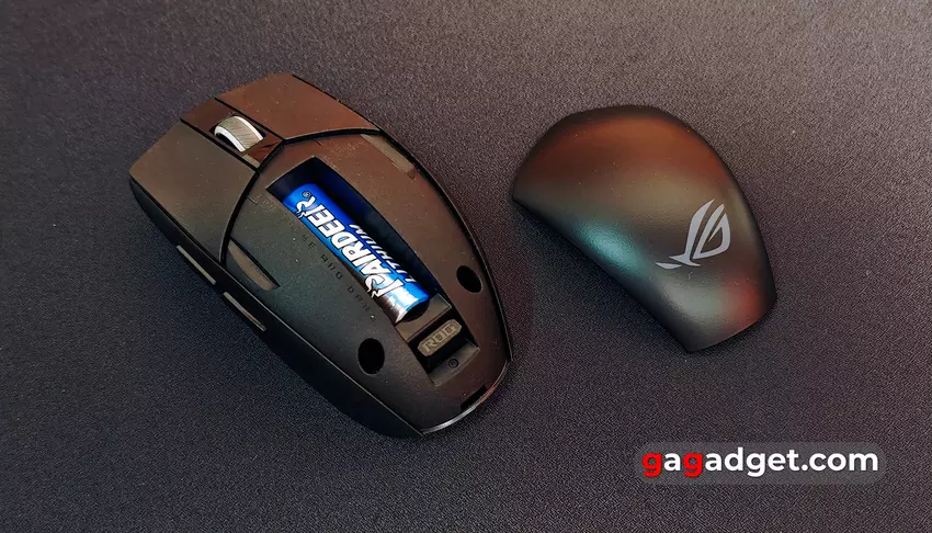 De ASUS ROG Strix Impact III Wireless is compact en vrij licht: 57 g zonder batterij en USB-zender. Met een AAA-batterij en adapter weegt hij 68 g, met een AA-batterij 72 g. Hoewel deze cijfers voorwaardelijk zijn, aangezien batterijen en oplaadbare batterijen iets kunnen verschillen in gewicht. De muis zelf is goed gemaakt van praktische materialen. Alle onderdelen passen perfect, niets wiebelt of schudt.