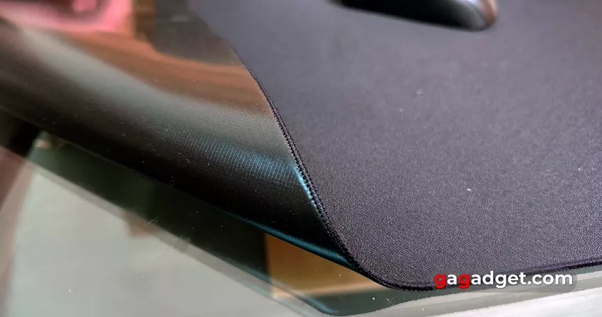 Het oppervlak is gemaakt van een hybride stof met een beschermende water-, olie- en stofafstotende coating. Het heeft een zeer fijne textuur en de muis glijdt er perfect overheen. Destandaarddikte is 3 mm en de basis is gemaaktvan zacht polyurethaanschuim met een hoge dichtheid en een geheugeneffect. Hij plakt letterlijk aan het tafeloppervlak en zit heel stevig vast in de gewenste positie. Je moet het letterlijk van de tafel afscheuren om de positie te veranderen.