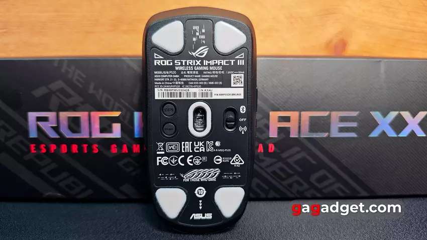 Hieronder bevinden zich vier driehoekige witte Teflon pootjes, een ROG AimPoint optische sensor met een dun Teflon frame, een schakelaar voor de verbindingsmodus en knoppen om te schakelen tussen DPI en verbindingsmodi. Ze worden ook gebruikt voor enkele aanpassingen onderweg.
