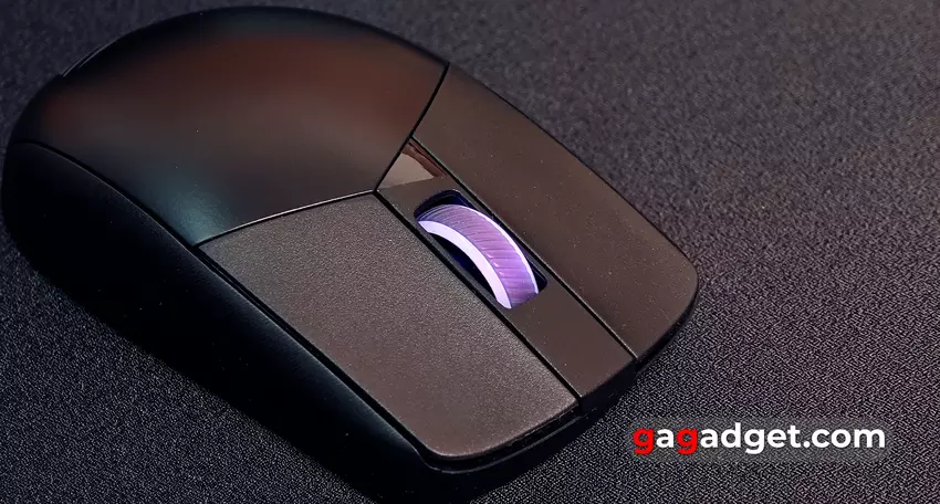 Het scrollwiel is het enige verlichte onderdeel van de muis. Het is doorzichtig, heeft een rubberen coating en diagonale inkepingen voor betere grip.