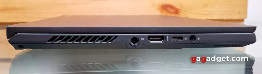 Alle aansluitingen bevinden zich aan de zijkanten van de laptop. Aan de linkerkant zitten de ventilatieopeningen voor het koelsysteem, een voedingsaansluiting, USB Type-C 4.0 (40 Gbps) met Display Port 1.4 en 100W Power Delivery, HDMI 2.1 en een coaxiale audio-aansluiting.