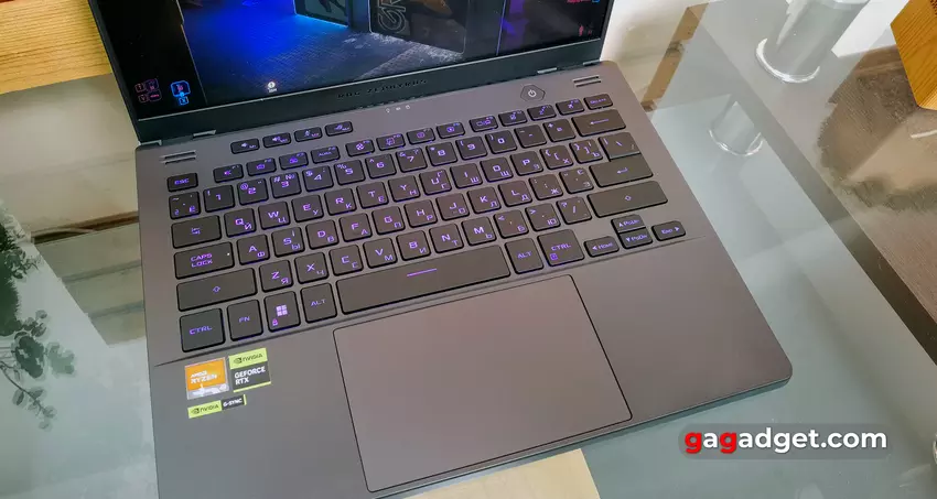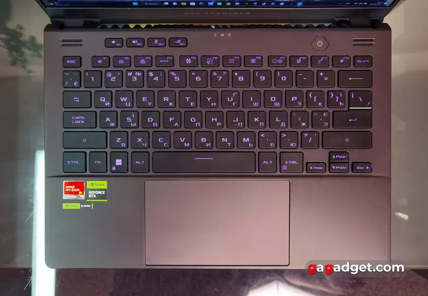 Het toetsenbord heeft een single-zone RGB achtergrondverlichting (zonder aparte instelling voor elke toets) met AURA Sync synchronisatie. Alle tekens worden gelijkmatig verlicht. De volledige travel van de toetsen is 1,7 mm. Het toetsenbord is comfortabel, de toetsen hebben een gematigd zachte informatieve aanslag en het is handig in gebruik.