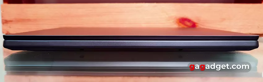 De laptop heeft geen uitsparing voor het optillen van de bovenklep, wat typisch is voor veel moderne modellen. Maar het wigvormige deksel is heel geschikt voor deze taak.