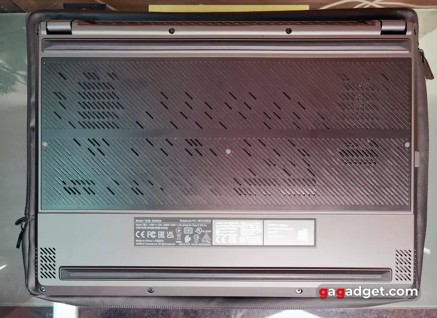 Het deksel is diagonaal in twee delen verdeeld. Het bovenste deel heeft 14.969 gaten, gemaakt op een CNC-machine, waaronder de AniMe Matrix LED's zitten. Vanwege de beperkte afmetingen kan er een IPS-scherm en AniMe Matrix worden gebruikt, of Mini LED, maar zonder AniMe Matrix. Wij ontvingen een model met Mini LED, en de gaatjes zijn gewoon glanzende inzetstukken die lichtjes glinsteren met verschillende kleuren bij verschillende lichthoeken. Linksonder zit een klein plaatje met het ROG-logo.