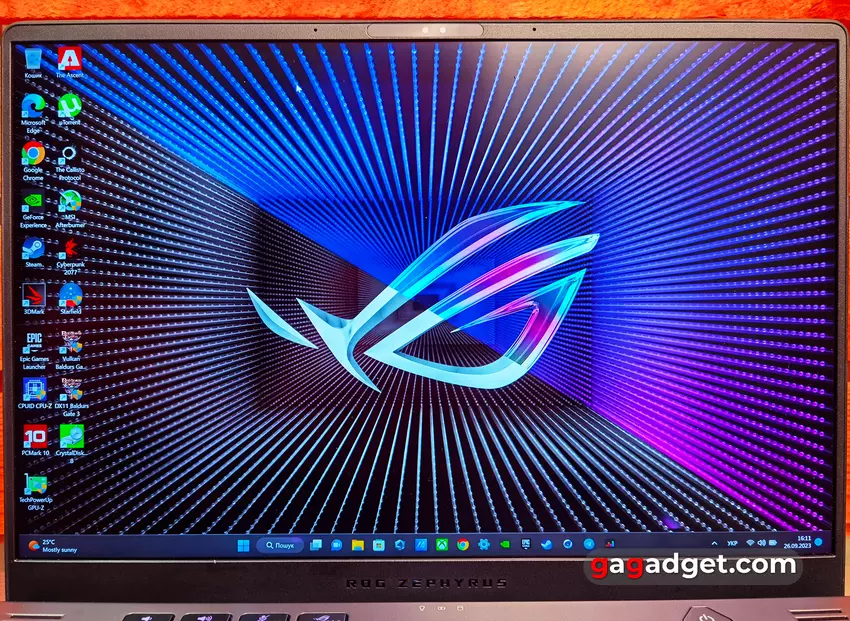ASUS maakt actief gebruik van Mini LED-schermen in zijn gaming laptops. De ROG Zephyrus G14 (2023) heeft zowel IPS als Mini LED ROG Nebula HDR Display configuraties. Het was de laatste variant die op onze redactie terechtkwam. Het scherm heeft een beeldverhouding van 16:10 en een WQXGA resolutie (2560x1600). De verversingssnelheid is 165 Hz en de pixelresponstijd is 3 ms. Volgens ASUS is het kleurengamma van het scherm 100% DCI-P3, is het scherm Pantone-gecertificeerd, heeft het Dolby Vision-ondersteuning en VESA Display HDR 600-certificering. Het belooft een maximale helderheid van 500 cd/m² en een piekhelderheid van 600 cd/m². Er is ondersteuning voor G-Sync framerate synchronisatie. De ROG Armoury Crate app heeft handige weergave-instellingen: matrix overdrive, energiebesparing (lagere vernieuwingsfrequentie) en multi-zone achtergrondverlichting, die wordt ingeschakeld in HDR-modus. Als multi-zone achtergrondverlichting is uitgeschakeld, ziet het scherm eruit als een gewone IPS. Het onderdeel Game Visual heeft verschillende beeldmodi. Het is ook mogelijk om het scherm te kalibreren met de X-Rite i1 Display Pro kalibrator.