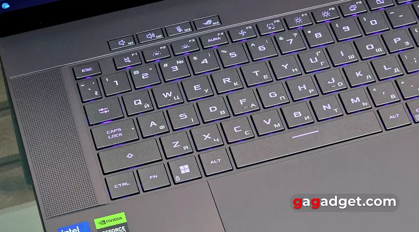 De laptop maakt gebruik van een verborgen scharnierontwerp, het zogenaamde Stealth Hinge. De maximale openingshoek van de laptop is ongeveer 135°. Voor het geval iemand echt 180° nodig heeft, legt ASUS uit dat ze dit hebben moeten opgeven om sommige ventilatiegaten niet te bedekken. Voor de rest is het ontwerp vrij vertrouwd met andere ASUS modellen: in geopende positie is de achterkant van het werkoppervlak iets verhoogd boven de tafel. Dit draagt ook bij aan een betere koeling van de componenten door de grotere ruimte eronder. Het toetsenbord is vrij typisch voor ASUS ultraportables: full-size, zonder extra numeriek toetsenblok. Er zijn vier extra knoppen boven de hoofdeenheid, typisch voor gaming modellen. Ze zijn verantwoordelijk voor het volume, het dempen van de microfoon en het starten van de eigen Armoury Crate applicatie. Je kunt macro's configureren voor deze knoppen. De aan/uit-knop bevindt zich ook boven het hoofdtoetsenblok en het zal extreem moeilijk zijn om deze per ongeluk in te drukken. De bovenste rij functietoetsen is verkleind, net als het navigatieblok. Beide verschuivingen zijn lang. De lay-out vergt geen extra tijd om eraan te wennen.