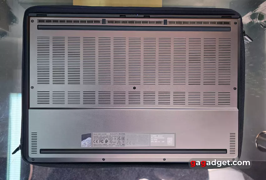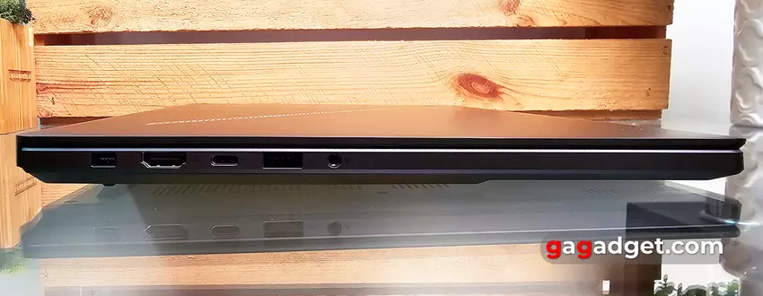 Alle aansluitingen bevinden zich aan de zijkant, de achterkant is gereserveerd voor koeling. Aan de linkerkant heeft de laptop een bijgewerkte eigen rechthoekige voedingsaansluiting, HDMI 2.1 FRL video-uitgang, Thunderbolt 4 (met DisplayPort ondersteuning voor geïntegreerde graphics en 100W Power Delivery), full-size USB Type-A 3.2 Gen 2, evenals een 3,5 mm audio-aansluiting.
