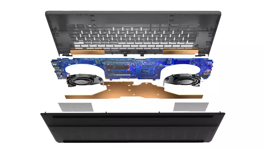 Het ROG Intelligent Cooling systeem in de ASUS ROG Zephyrus G16 (2024) omvat een enorme heatsink, een grote verdampingskamer en twee 2e generatie Arc Flow ventilatoren. Thermal Grizzly vloeibaar metaal wordt traditioneel gebruikt als thermische interface.