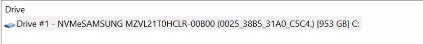 De schijf is een 1TB Samsung PM9A1 SSD met PCI-E 4.0 4x interface. De aangegeven leessnelheid is tot 7000 MB/s en de schrijfsnelheid tot 5100 MB/s.