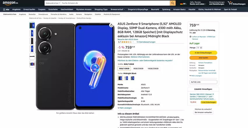 De ASUS Zenfone 9 in de 8/128GB variant is nu te koop op Amazon voor 799,00 €. Er zijn ook andere modificaties beschikbaar, maar die worden zonder korting verkocht.