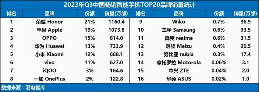 Chaodian Think Tank publiceerde statistieken van de Chinese smartphonemarkt in het derde kwartaal van 2023. Honor en Apple werden de enige bedrijven die meer dan 10 miljoen toestellen wisten te verkopen.